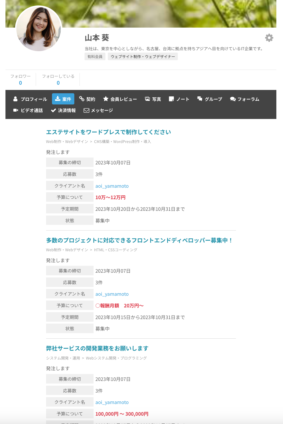 ヘッダー画像やプロフィール画像は必ず設定しましょう。情報が充実しているほうがマッチングには有利です。案件がなくても、プロフィールを見て直接コンタクトしてくる人もいます。