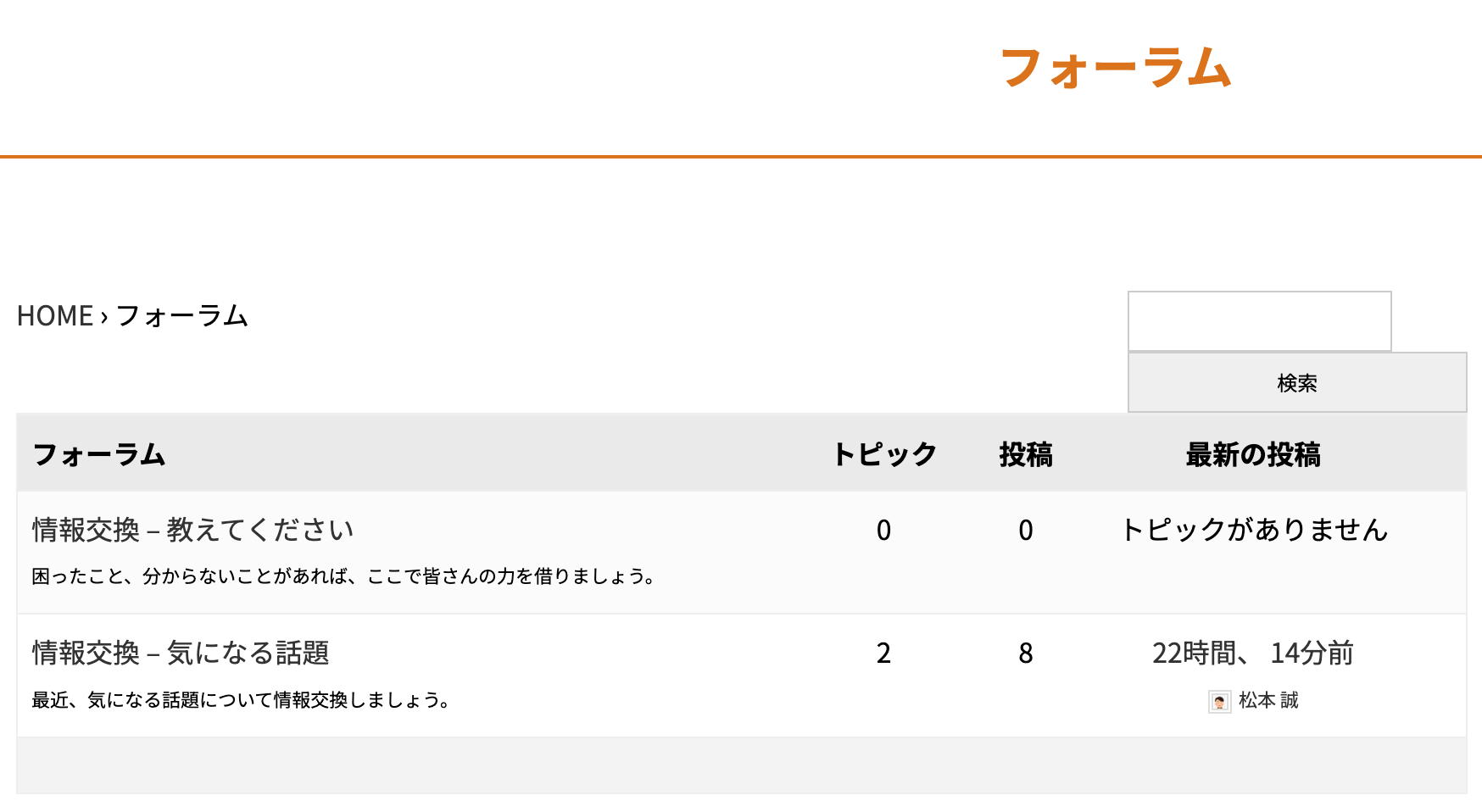 メニューから「フォーラム」をクリックすると、フォーラムが一覧表示されます。検索にキーワードを入れて検索すると検索結果が表示されます。HOME>フォーラムをクリックするとフォーラム一覧に戻ります。